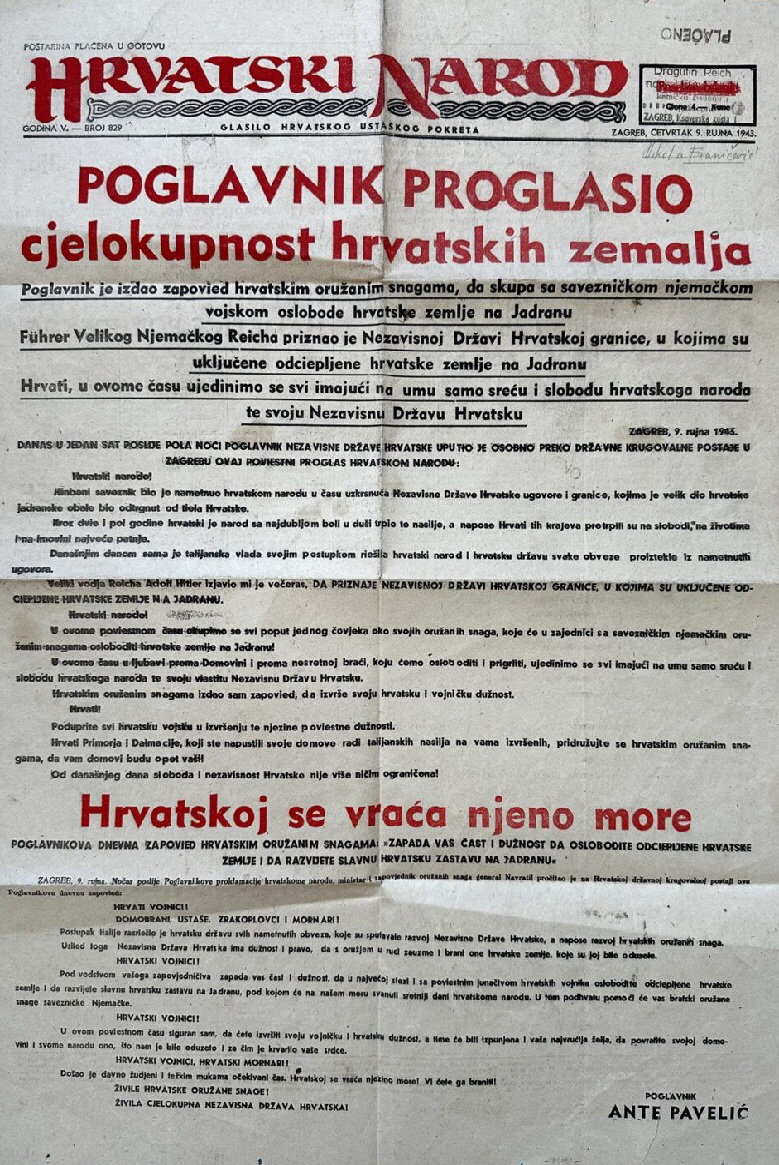 Tijekom Drugog svjetskog rata i nakon Travanjskog rata 1941. godine dr. Ante Pavelić se vraća iz egzila i postaje Poglavnik Nezavisne Države Hrvatske, koju je Slavko Kvaternik proglasio 10. travnja 1941. godine.