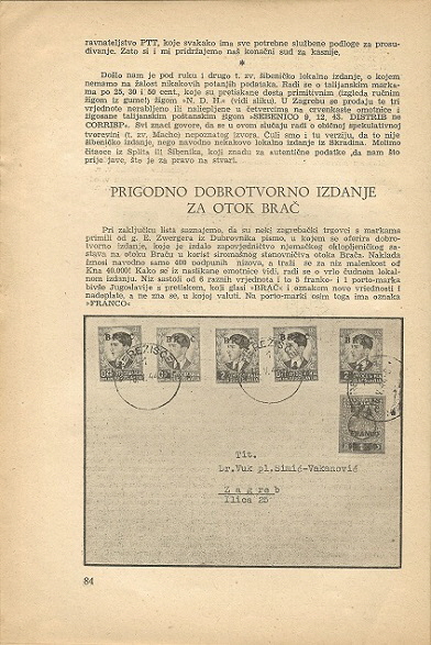 U glasilu Hrvatskog filatelističkog saveza u Zagrebu u izdanju broj 7-9 od srpnja-rujna 1944. godine se na stranici 84 i 85 moze pročitati o dobrotvornim izdanju za otok Brač.