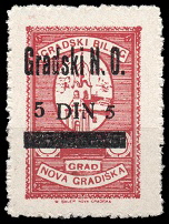 Preštampane marke u crnoj boji sa “Gradski Narodni Odbor” i novoj valuti u Dinarima.