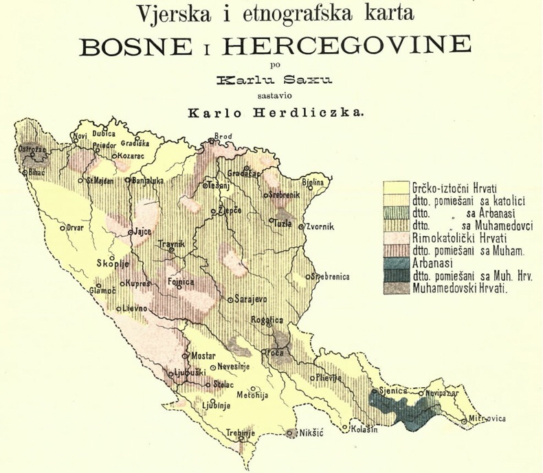 Gore : Vjerska i etnografska karta Bosne i Hercegovine iz 1875 godine. Autor Karl Sax.