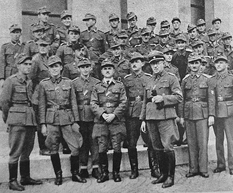 Gore : Pripadnici Hrvatske istarske (domobranske) pukovnije i zapovjednik te postrojbe, SS-bojnik (SS-Sturmbannführer) Mihovil Karlo Sertić u prvom redu.