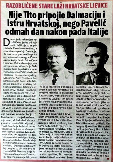 Kasnije se je to rakomadanje hrvatskog teritiorija od strane (jugo)-srpskog ministra Nikole Pašića htjelo prepisati Poglavniku dr. Ante Paveliću. Trvdilo se je da je on "prodao" ta područje Italiji. Kako je mogao Poglavnik dr. Ante Pavelić nešto "prodati" sto uopće nije bilo dio Nezavisne Države Hrvatske? To je nemoguće! Srbin Nikola Pašić je prodao/poklonio ta područja Talijanima a ne Poglavnik i to 21 godina prije uspostavanja Nezavisne Države Hrvatske. To negiraju samo oni koji neznaju za "povijest" nego znaju samo za "istoriju" koju su im tumaćili neki iz naroda notornih lažljivaca a sto su prihvatli "naše" domaće sluge Beograda!