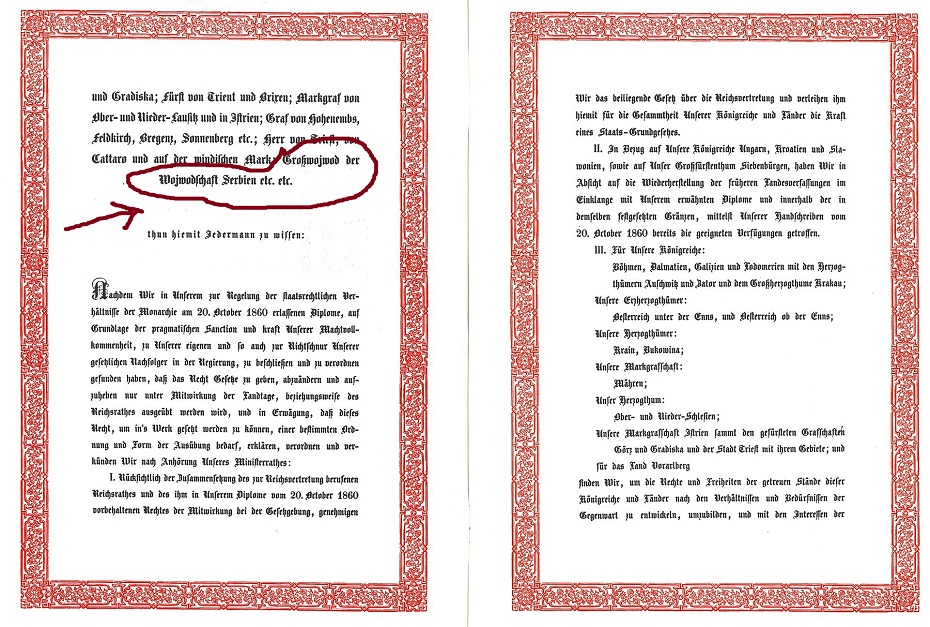 Kako vidite dolje je Franjo Josip I. bio "Großwojwod der Wojvodschaft Serbien”, šta znaći “Veliki-Vojvoda Srbije”.