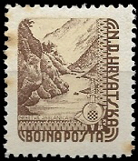 Marka prikazuje dolinu Neretve kod Jablanice, desno dolje znak hrvatske vojne pošte.