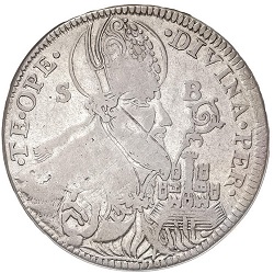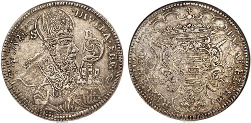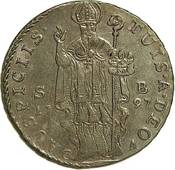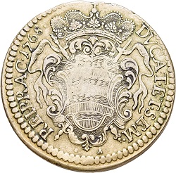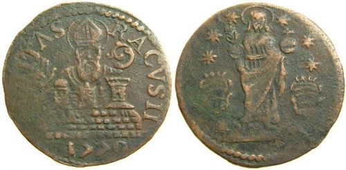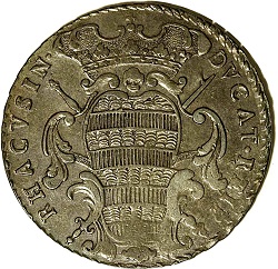 12. Dukat, srebrni poveći novac, kovan 1723 i 1797, s većom slikom sv. Vlaha na licu, s monogramom S—B i godinom kovanja te nadpisom: TVIS A DEO AVSPICIIS ; na naličju je grb Dubrovačke republike s kneževskom krunom i nadpis: DVCAT(us) REIP(ublicae) RHACVSINAE; vel. 40 mm (1723 g.) i 37 mm (1797); tež. 19·165 g i 13·370 g, vriednost 40 Dinarića ili 240 Solda;