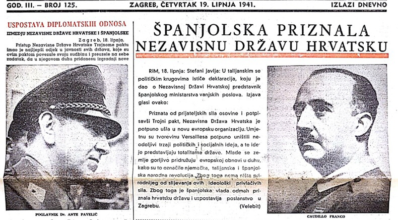 Službenu obavijest o uspostavi Nezavisne Države Hrvatske španjolskoj je vladi tek 14. lipnja 1941. poslao ministar Lorković. Španjolski konzul iz Sušaka Marchese del Castanar je 25. lipnja javio da je španjolska vlada, posredovanjem talijanskoga veleposlanstva u Madridu, i formalno priznala Nezavisnu Državu Hrvatsku. Akt o priznanju izdan je 27. lipnja, a u Zagrebu je primljen 4. srpnja.