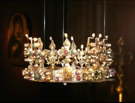 Čuva se u Zadru, teška kruna od čistog zlata, dragih kamenja i perli. Kraljica Jelisava Anžuvinska-Kotromanić je za tu krunu izvela vez u tehnici zlatoveza koji je isto očuvan. [ Pročitaj više ]