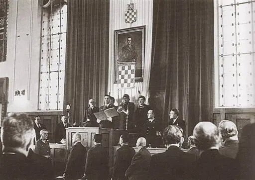 Lijevo : Poglavnik dr. Ante Pavelić otvara Hrvatski Državni Sabor 1942. godine.