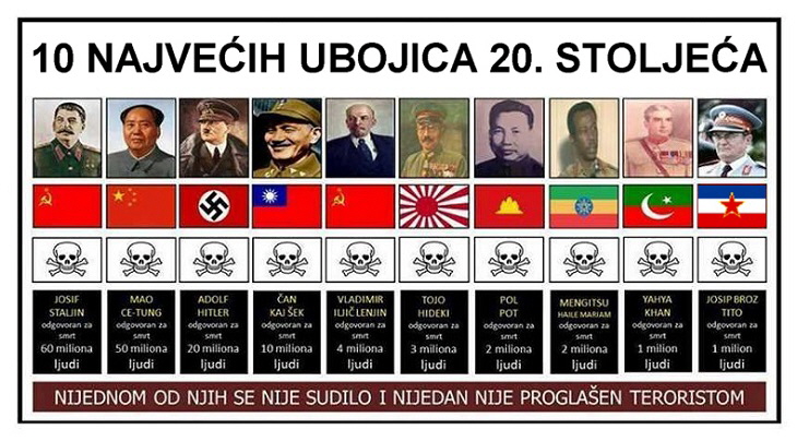 Gore : Lista najveći zločinaca i monstruma u 20. stoljeću. Tito se nalazi na 10 mjestu. Pitanje za teške “Jugoslavenčine”, domaće izdajnike i bradate četničke balkanske nomade : kako to da na tim listama nema nikada Poglavnika dr. Ante Pavelića koji je po jugo-srpskim mitomanima ubio 1,7 miliona takozvani “Srba”?