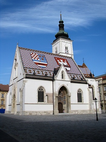 Gore : Grb Trojedine Kraljevine Dalmacije, Hrvatske i Slavonije na crkvi Sv. Marka u Zagrebu.