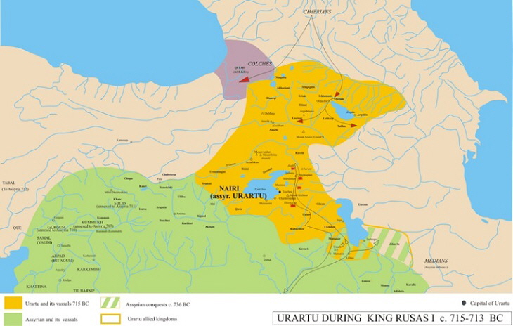 - Russas I. 735. - 714.: počinju jači napadi južnih Asiraca iz Mezopotamije i još sjevernih nomadskih Kimeriaca preko Kavkaza, početak slabljenja.